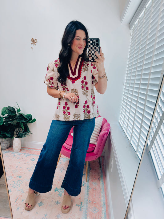 Ecru Floral Maroon Scallop Top