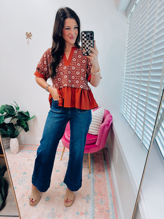 CURVY Darcy Floral Mix Media Top - Rust