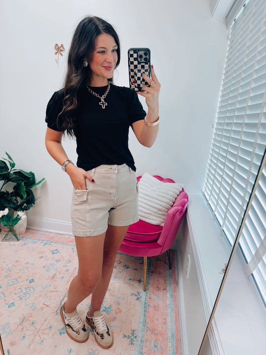 CURVY Khaki Risen Cargo Denim Shorts