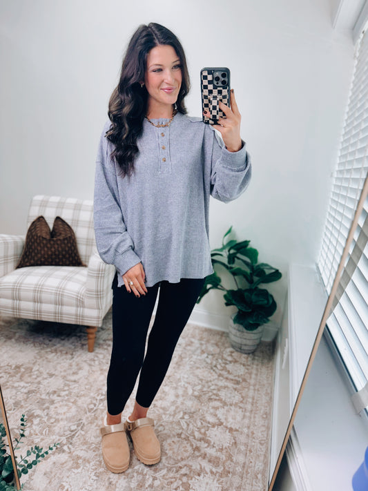 CURVY | DOORBUSTER Button Brushed Ribbed Sweater - Heather Gray