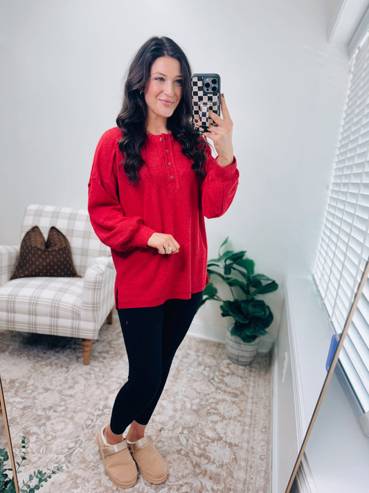 CURVY | DOORBUSTER Button Brushed Ribbed Sweater - Red