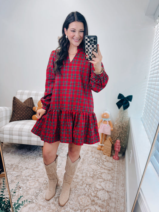 CURVY Smocked Plaid Tie Midi Dress - Red