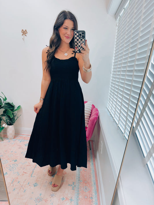 Sweetheart Smocked Bow Strap Midi Dress - Black