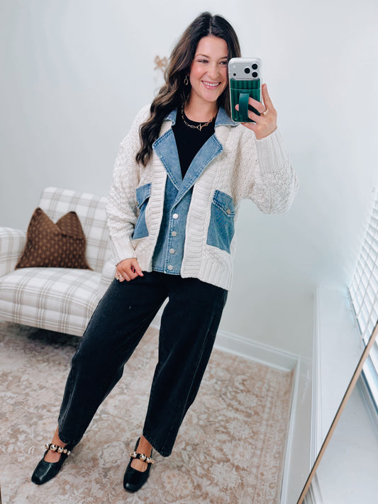 Mixed Media Cable Knit Denim Cardigan Top