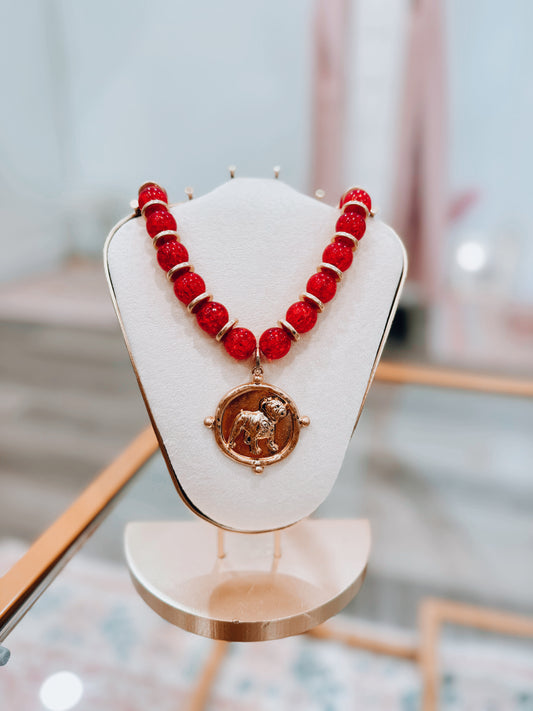 Chunky Chain Bulldog Coin Necklace - Red