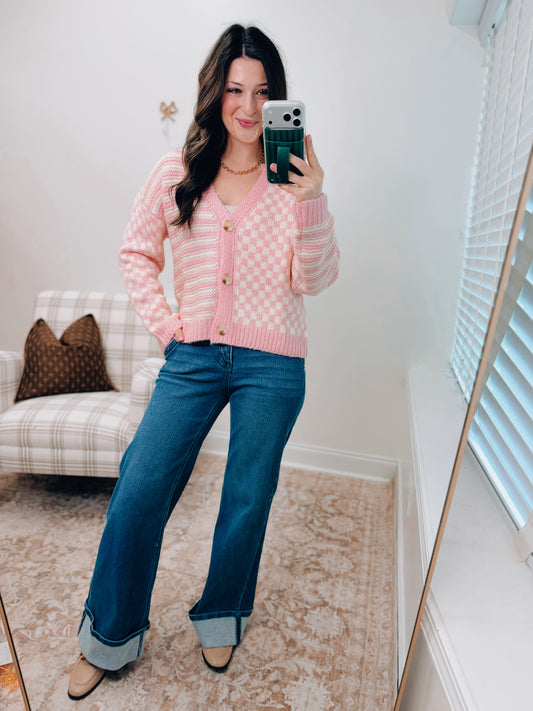 Checker and Stripe Cardigan Sweater - Pink