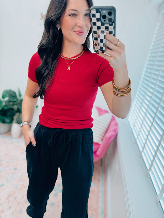 Essential Short-Sleeved Micro-Ribbed Top - Garnet