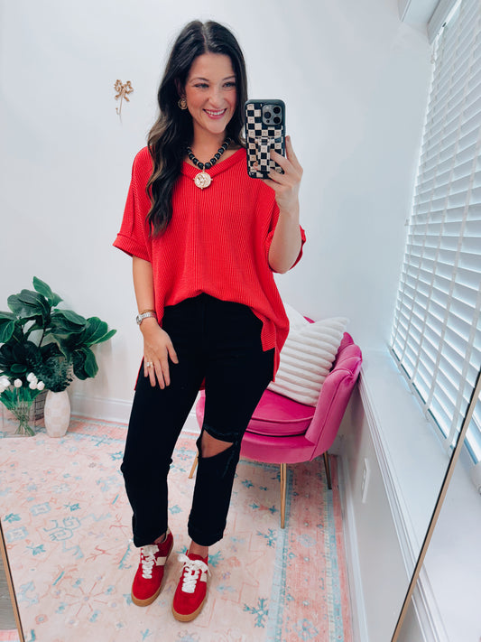CURVY Ruby Ribbed V-Neck Oversized Top
