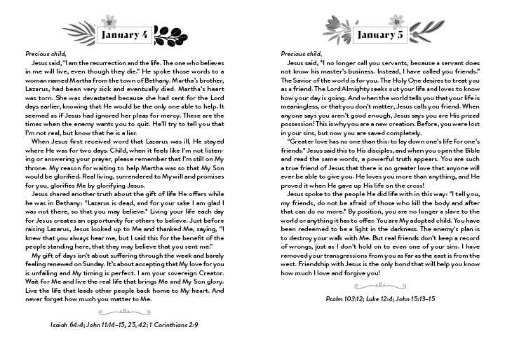 365 Days in God's Presence is an inspiring daily devotional that offers engaging and encouraging messages from God and His Word. With messages like: “I go before you today. I fight for you today. And I carry you today. Trust Me, child. I will show you the way out of the desert. Follow Me wholeheartedly. . . . I love you.” . . .these devotions will change your heart, increase your faith, and connect you to your loving heavenly Father as you've never been before. Each day of the year, you will encounter a moving, blessings-filled reading that has powerful potential to impact your life.