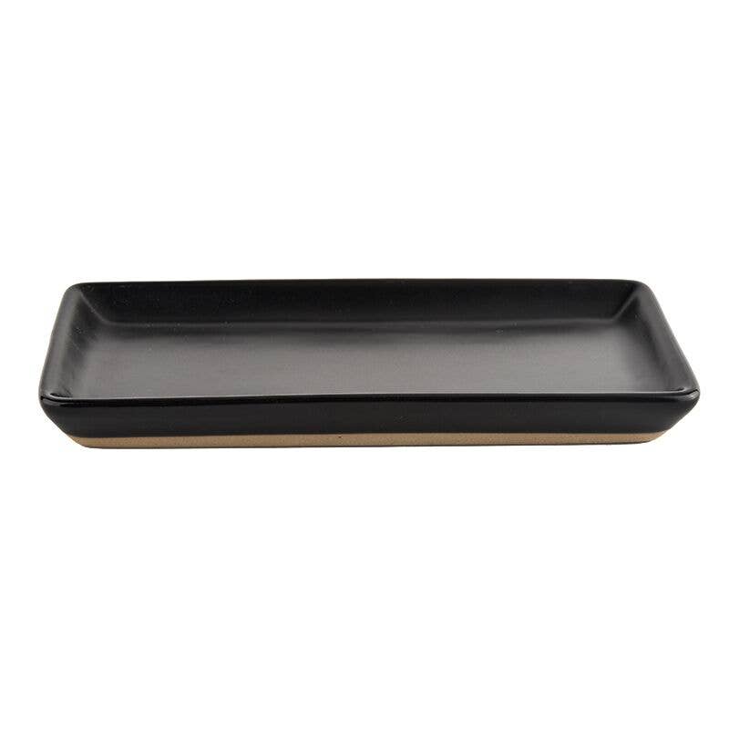 Our stoneware tray is the perfect addition to any kitchen and home. Use them to corral soap dispensers and scrub brushes at the kitchen sink, or as a vanity tray in the bathroom. They are also perfect for pairing our signature candles with our stylish safety matches. These modern trinket dishes can be used as a jewelry dish, key holder, and even as an appetizer plate! The uses are endless for our modern black rectangle dish.