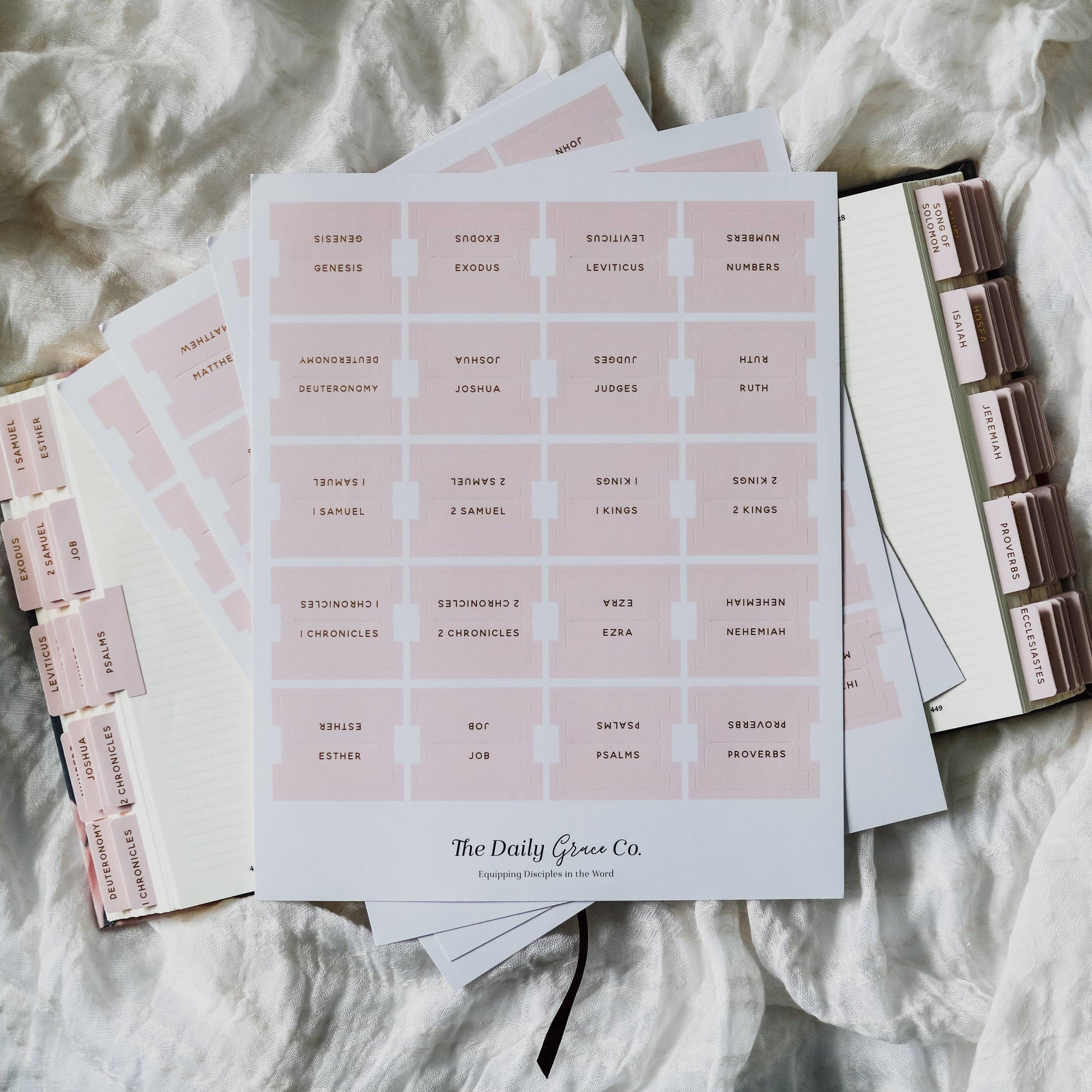 Flexible, matte coated sticker Bible tabs. Each set includes one double-sided tab for each book of the Bible as well as 23 additional sticker tabs.