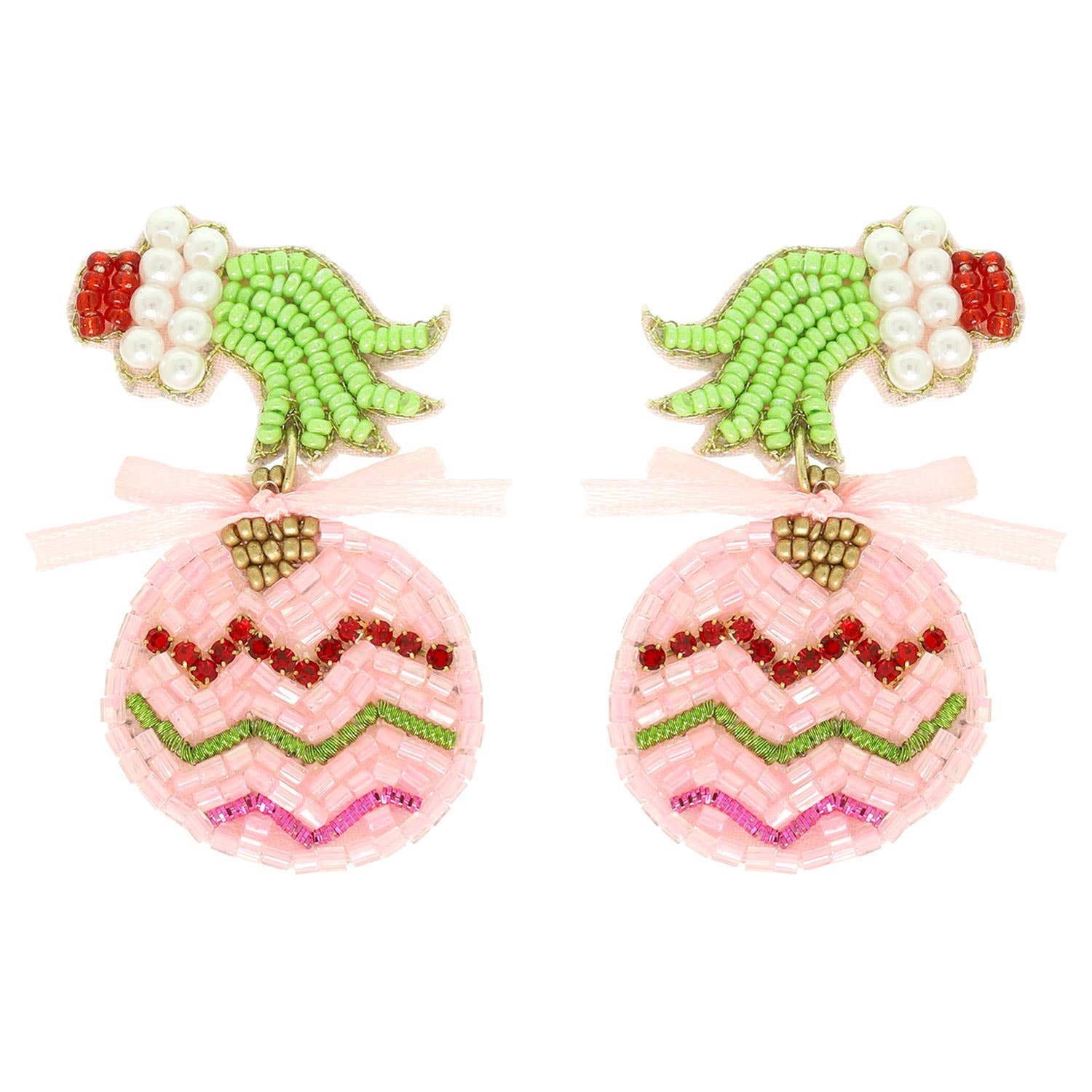 Christmas Seed Beaded Grinch Holding Ornament Earrings
