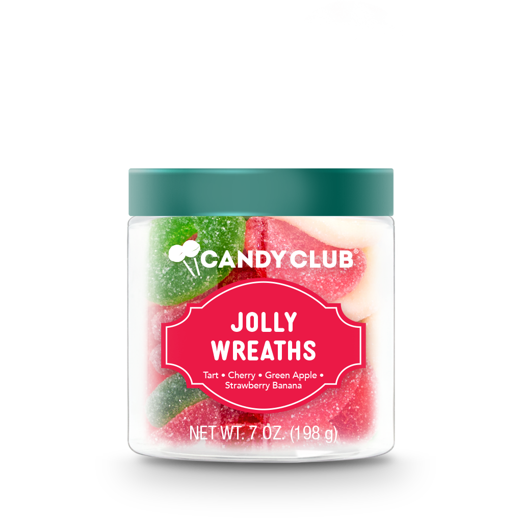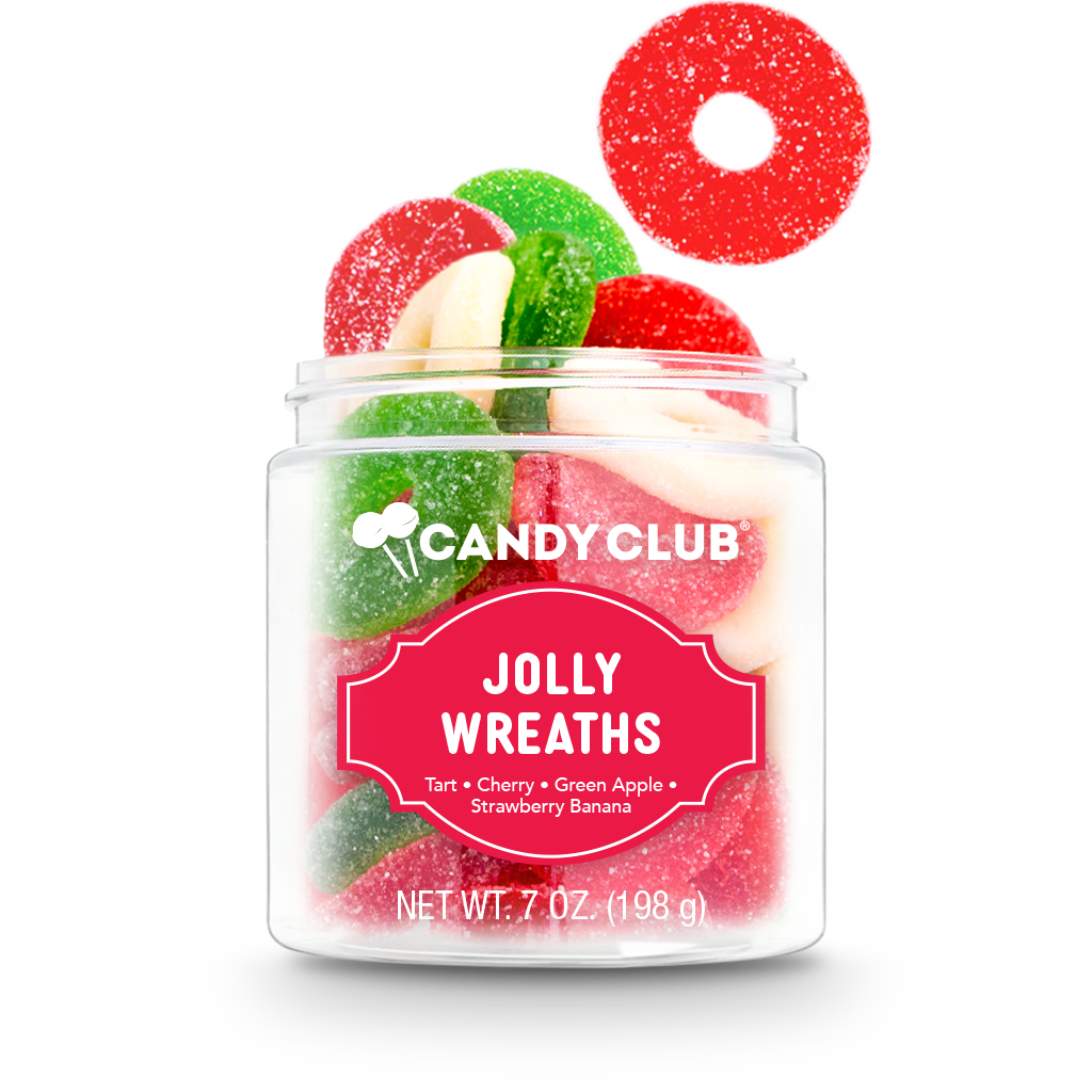 Have a holly jolly time with these gummy wreaths! Tart wreaths come in a mix of cherry, green apple, and strawberry-banana flavors.