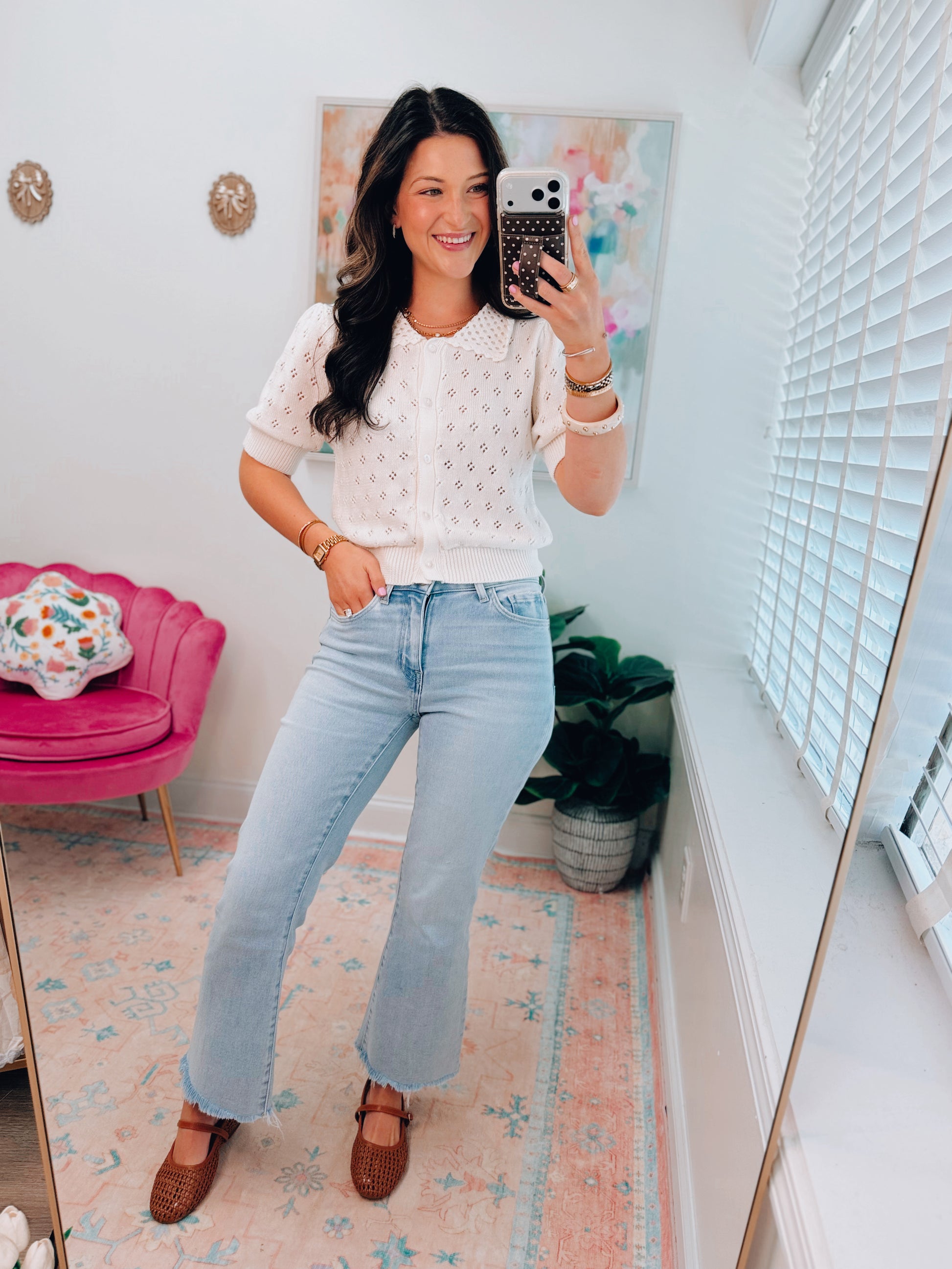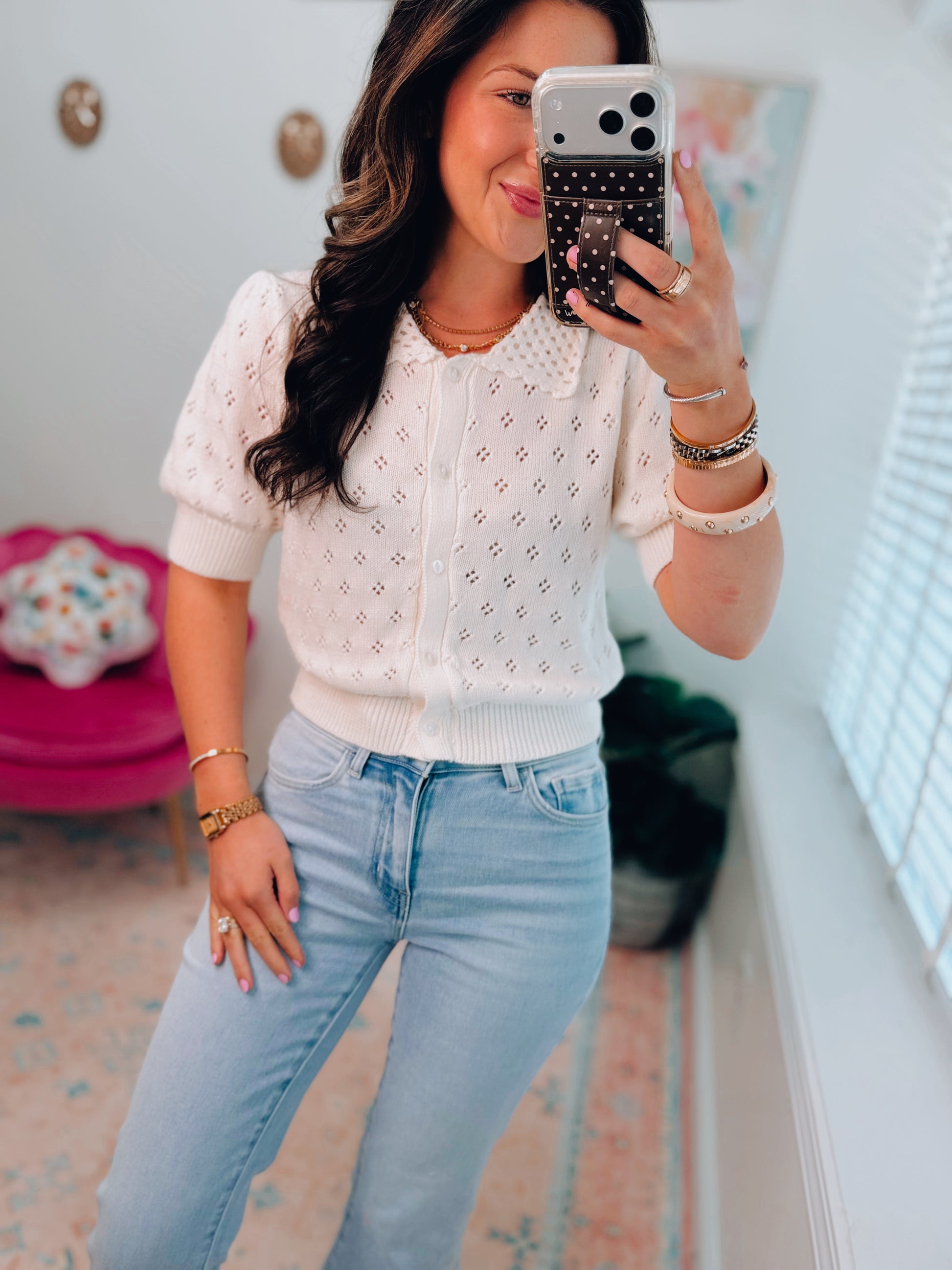 Pointelle Collar Button-Up Puff Sleeve Knit Top