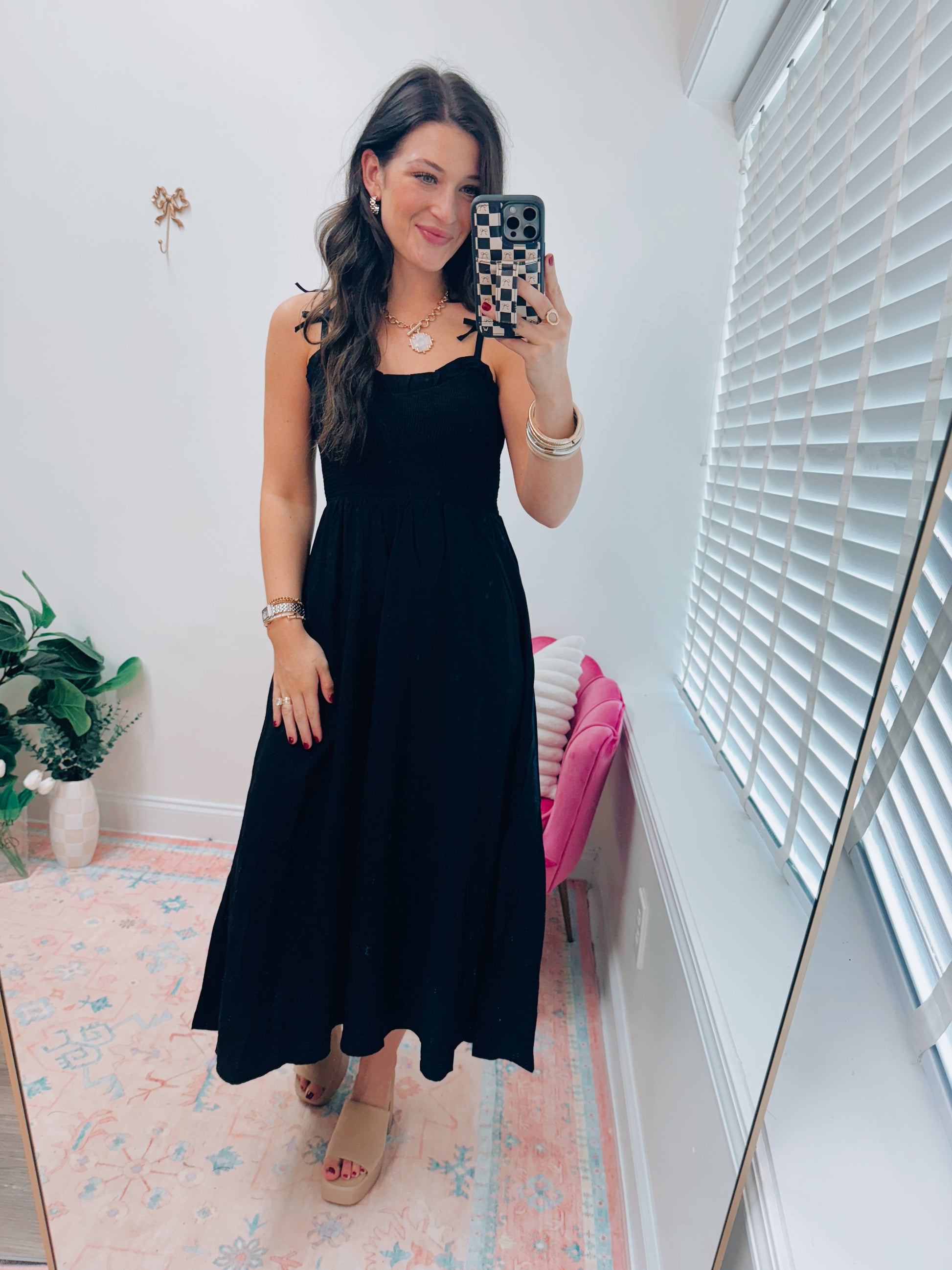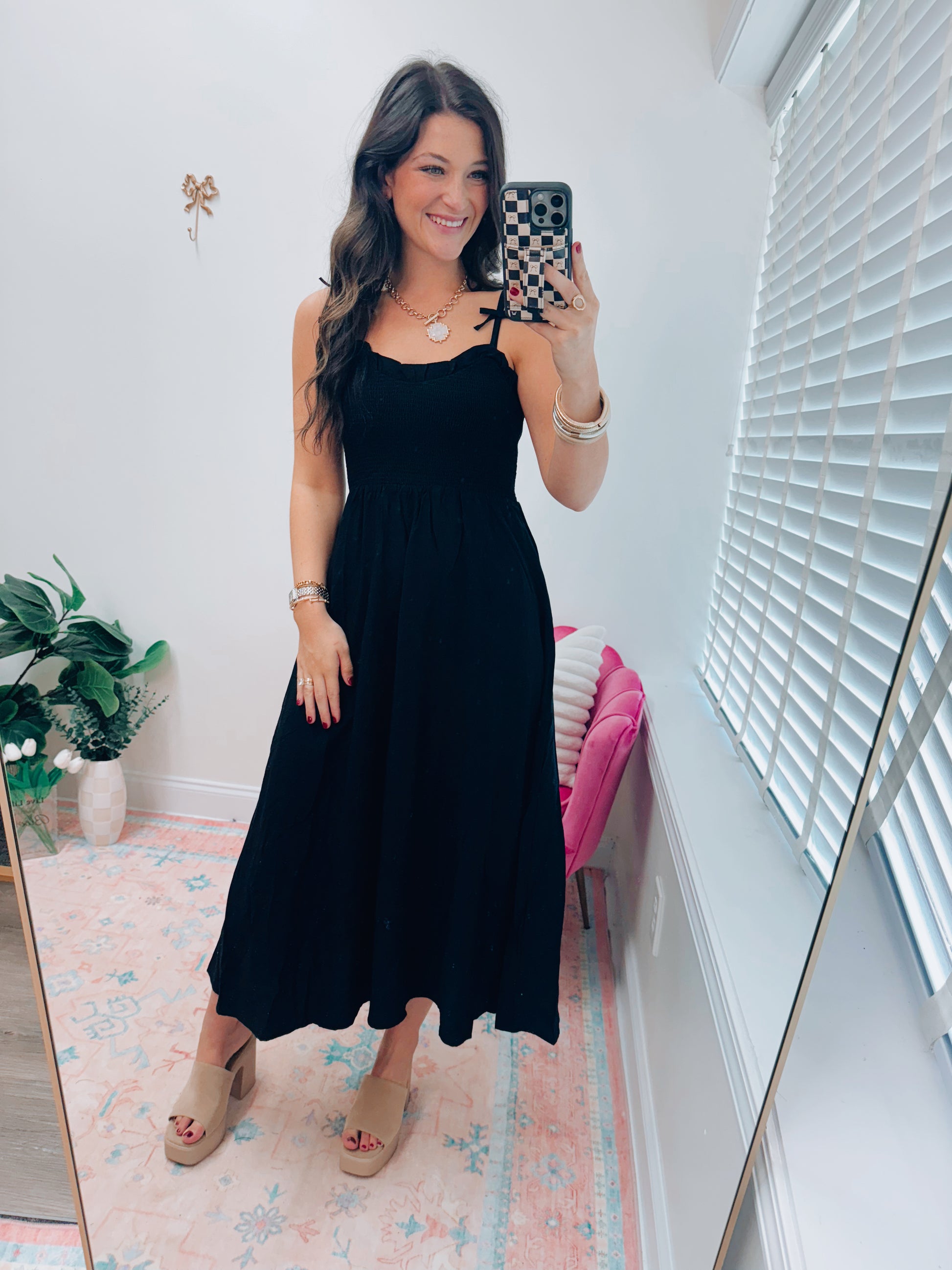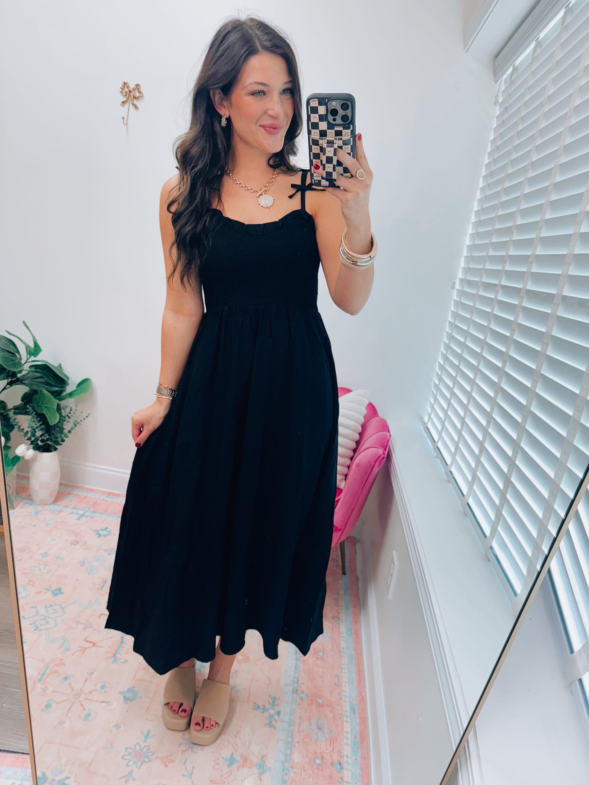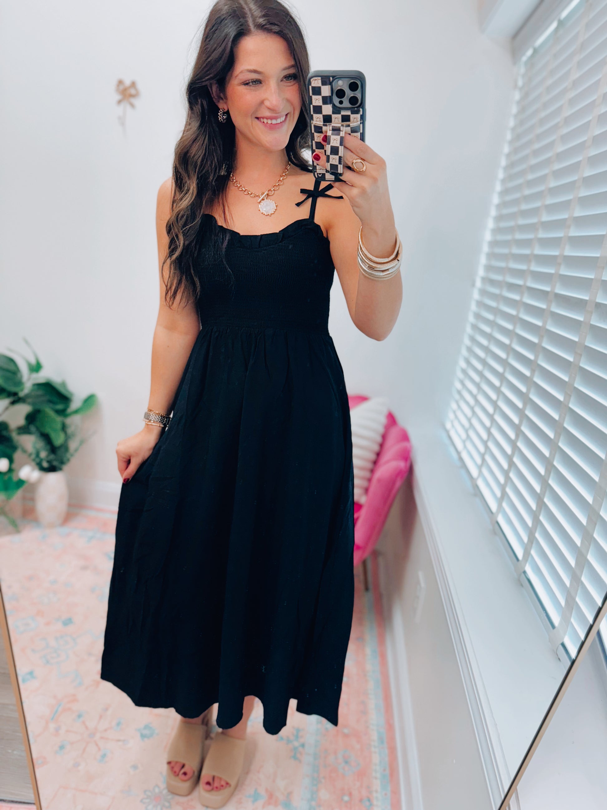 Sweetheart Smocked Bow Strap Midi Dress - Black