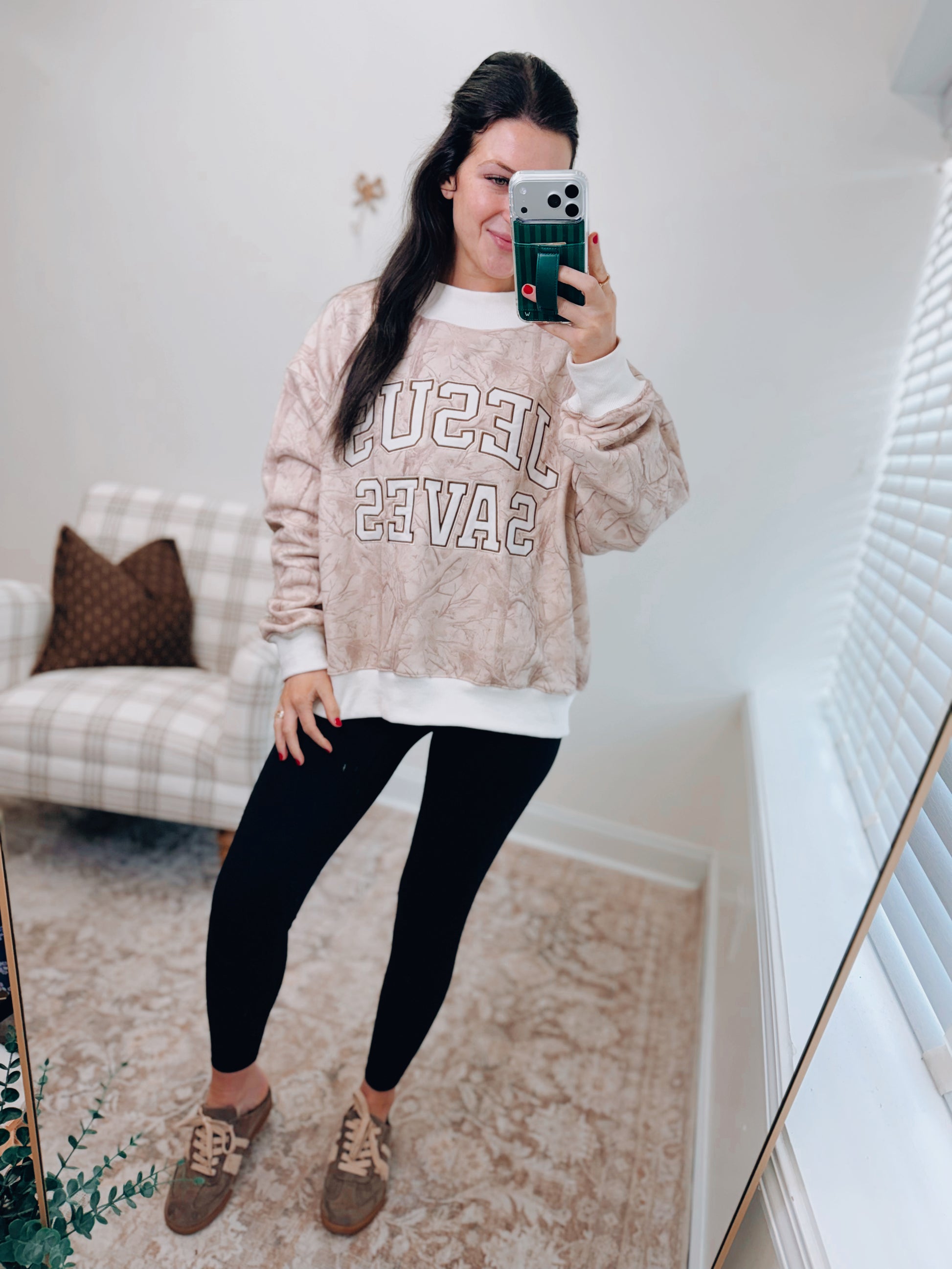 We recommend sizing UP for that loose, boxy, throw-on-with-leggings fit!