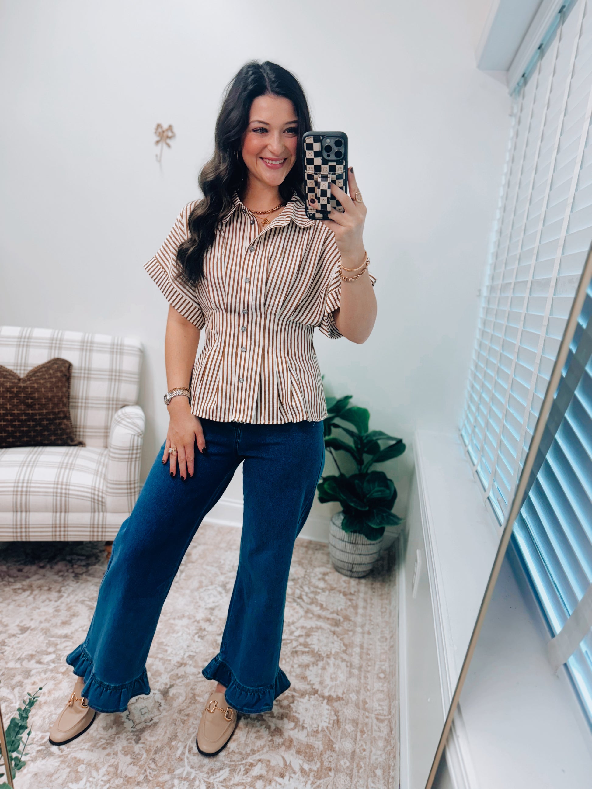 Willow Striped Pleated Button Top - Brown